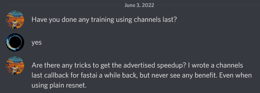 Feeling a bit stuck, we presented our results to the fastai development channel. At this point we thought TensorBase was slowing down channels last format training, but mixed precision training was unaffected.