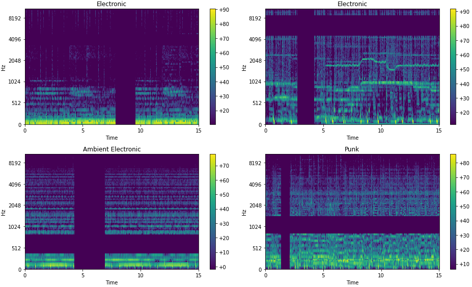 TensorMelSpec using fastai’s show_batch.TensorMelSpec stores the metadata passed to the MelSpectrogram transform which created it. This metadata is used in TensorMelSpec augmentations which use typesTechnically it uses type dispatch. to only apply to TensorMelSpec tensors and the metadata automatically populates transform arguments. Then fastai’s show_batch calls the TensorMelSpec.show method, which uses the metadata and librosa for plotting, generating the sample batch shown above.