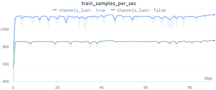 This results in a ~150-200 images/second decrease in GPU throughput across VoltaUsing a Google Cloud V100 instance. and Ampere generations compared to a training step using torch.Tensor. In channels last format, the throughput difference increases to ~370-400 images/second on a 3080 TiUsing a runpod.io 3080 Ti community instance.. Both examples use a torchvision ResNet50, 224-pixel image size, batch size of 64, and mixed precision.